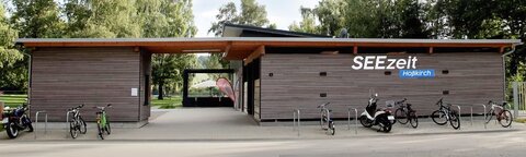 Hier lässt sich im Seecafé eine gemütliche Kaffeepause einlegen und/oder eine Runde im herrlich gelegenen Natursee schwimmen.