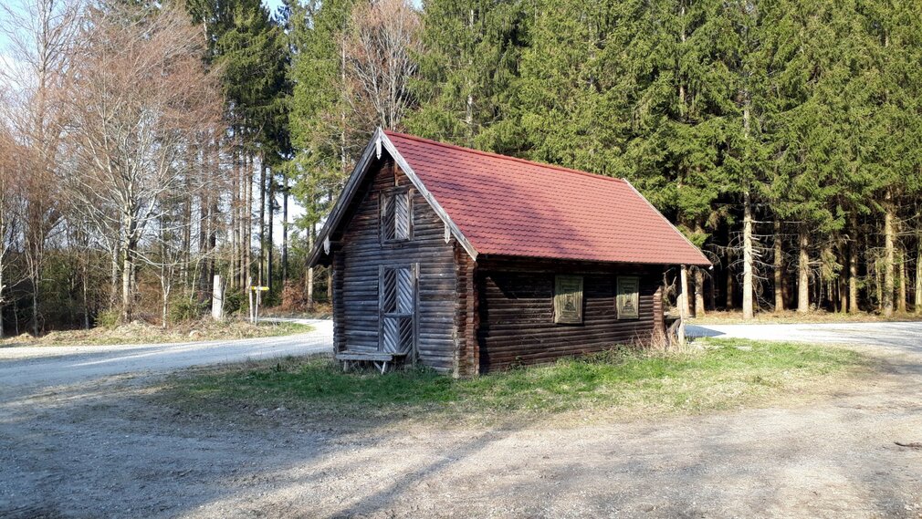 Wir fahren wieder leicht in den Wald, biegen rechts → ab und queren, an einer Holzhütte vorbei, die Lichtung.